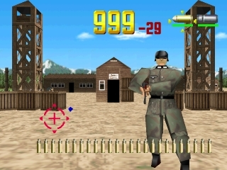 Nun zum Spiel: Die Grafik ist schlecht. Richtig schlecht. Selbst für PS1-Verhältnisse ist die Grafik schlecht. So schlecht, dass ich lange damit gehadert habe, das Spiel überhaupt zu kaufen (aber es ist ein Lightgun Shooter, deshalb musste ich ja über kurz oder lang... ;) ). Doch das Gameplay ist zum Glück das genaue Gegenteil. Ziemlich rasant und abwechslungsreich, mit einem fordernden Schwierigkeitsgrad. Bei diesem Rail Shooter wurde auf Nachladen, Deckung und sonstigen Schnickschnack verzichtet. Stattdessen bekommt man für jeden Treffer, den man einstecken muss, Zeit vom Timer abgezogen. Ist dieser bei 0 angekommen, ist das Level verloren.