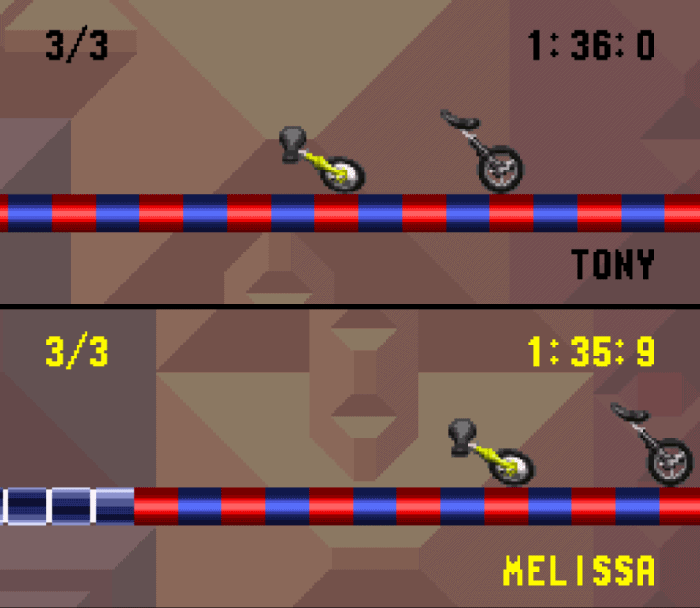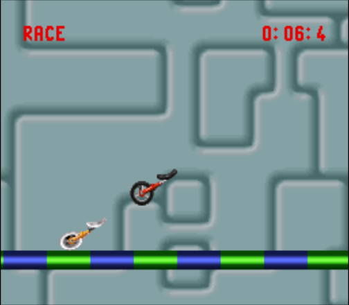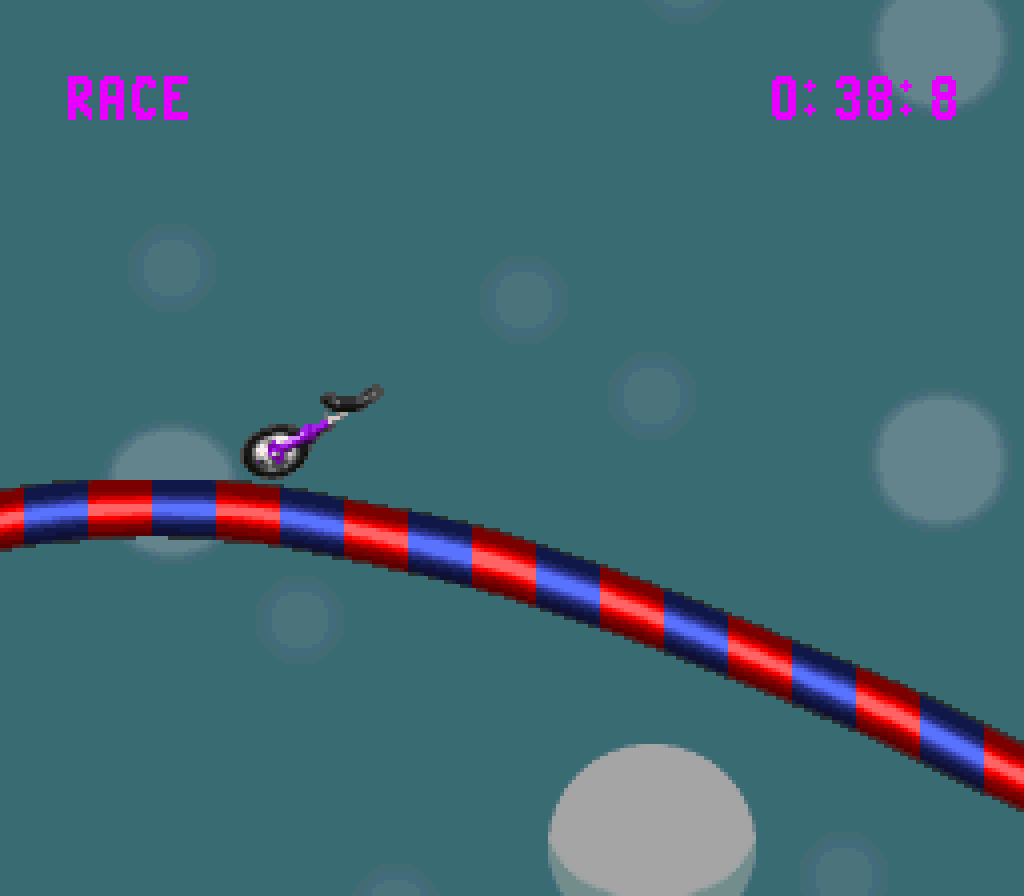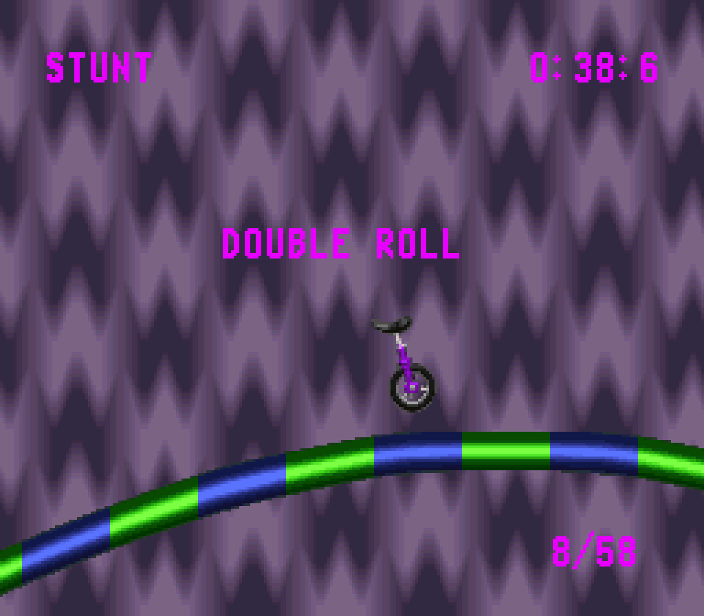Dies ist ein Funracers aller erster Güte. Man fährt als Einrad (genau, man IST das Einrad) über Fantasiekurse und versucht, eher im Ziel zu sein als sein Gegner. Klingt erstmal nicht sonderlich spannend? Stimmt. Deshalb kann man mit dem Einrad Stunts durchführen. Jeder gelungene Stunt gibt einen Geschwindigkeitsboost. Vermasselt man die Landung, so verliert man jegliche Geschwindigkeisvorteile und muss hilflos zusehen, wie der Gegner wieder an einem vorbeigeschossen kommt.
